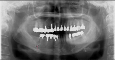 (1)不十分な根管(神経の通っていた管)治療が原因で右下の顎が腫れています。(↑病巣