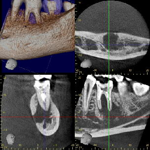 CT画像:当初病巣の下底は下顎管付近まで、また頬側の皮質骨にも穴が開いています