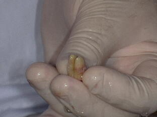 のプラスチック前装冠です。表面がプラスチックの為時間の経過と共に材料が徐々に劣化 して変色をきたしています(下左図)。ひどい場合には削れて裏打ちの金属が見えてくる こともあります。 ![]() ![]()