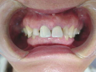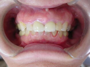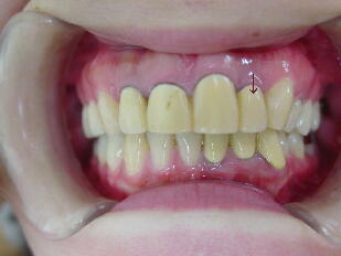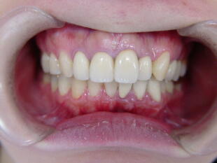 てある状態)で、上の前歯部はブリッジの状態でした。その歯を唇側に引き出して1歯ずつ 独立した状態にし、セラミック冠を装着しました。歯磨きが容易になったので歯肉状態が 改善され、きれいなピンク色を呈しています。 4.低位咬合の改善